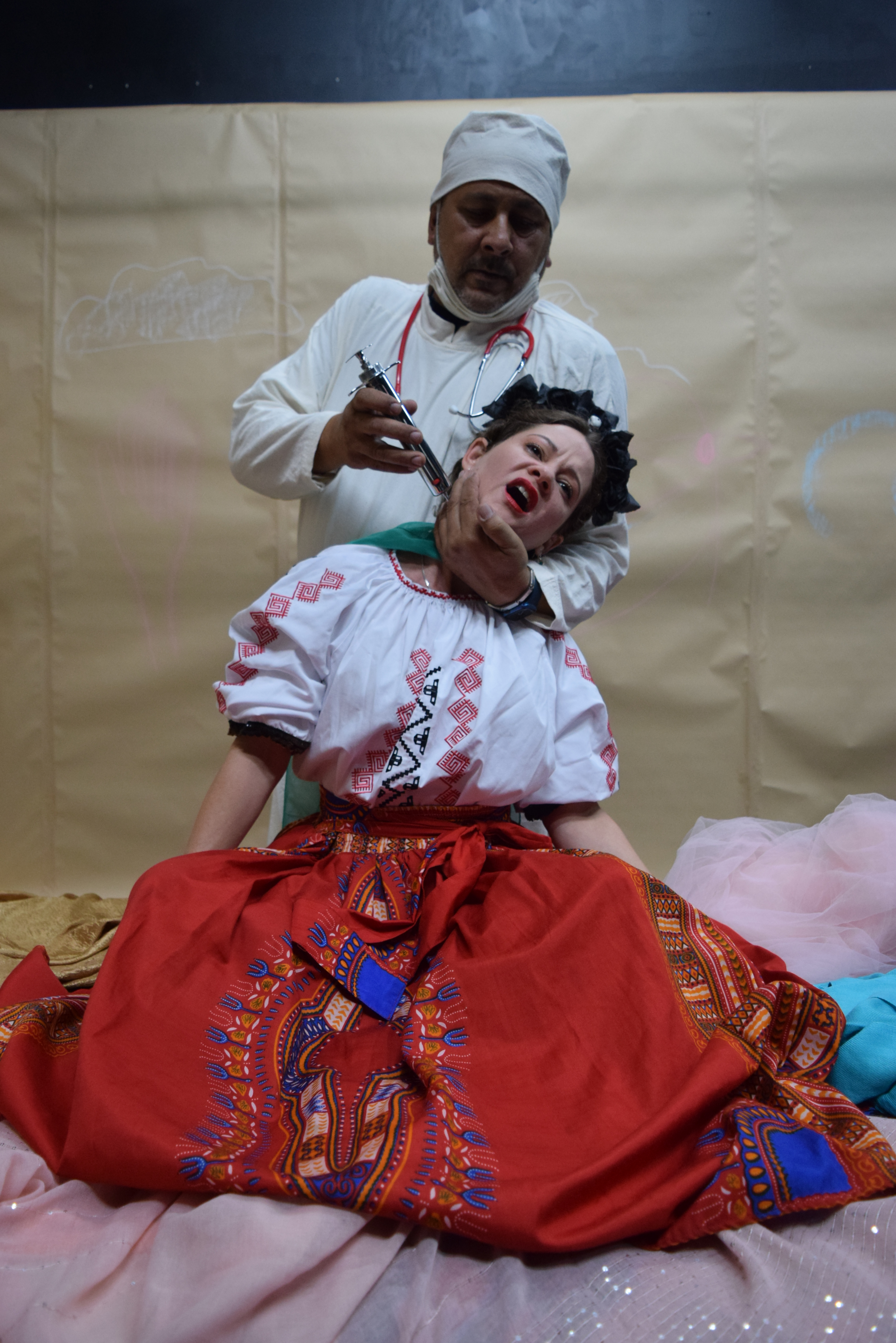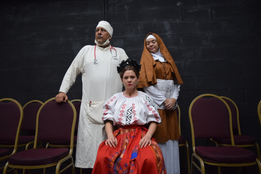 «La Monja con sus frustraciones (‘Dios, por qué me has hecho cubrir el cuerpo con estos ceñidos hábitos’). Ella se siente martirizada como todas las noches, y en medio de ese dolor encarna a Frida», detalla.